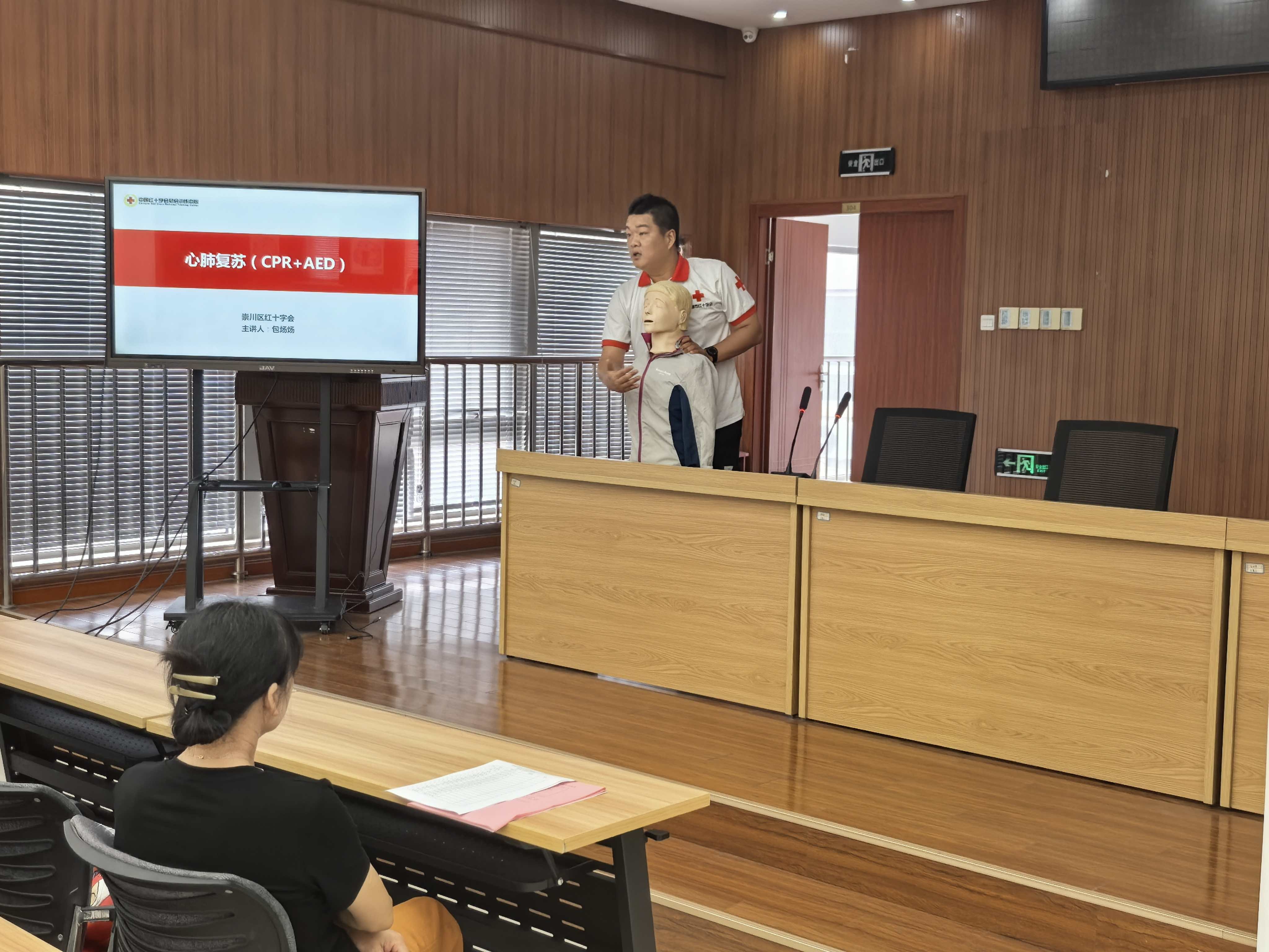 培训中,红十字会专业讲师以“理论+实操”结合的方式展开教学。讲师首先通过PPT和视频,清晰讲解了心肺复苏的重要性、适用场景及核心原则,重点拆解了“判断意识与呼吸”“胸外按压”“开放气道”“人工呼吸”四大关键步骤,对按压深度、频率、手势角度等细节进行反复强调,纠正常见操作误区。
