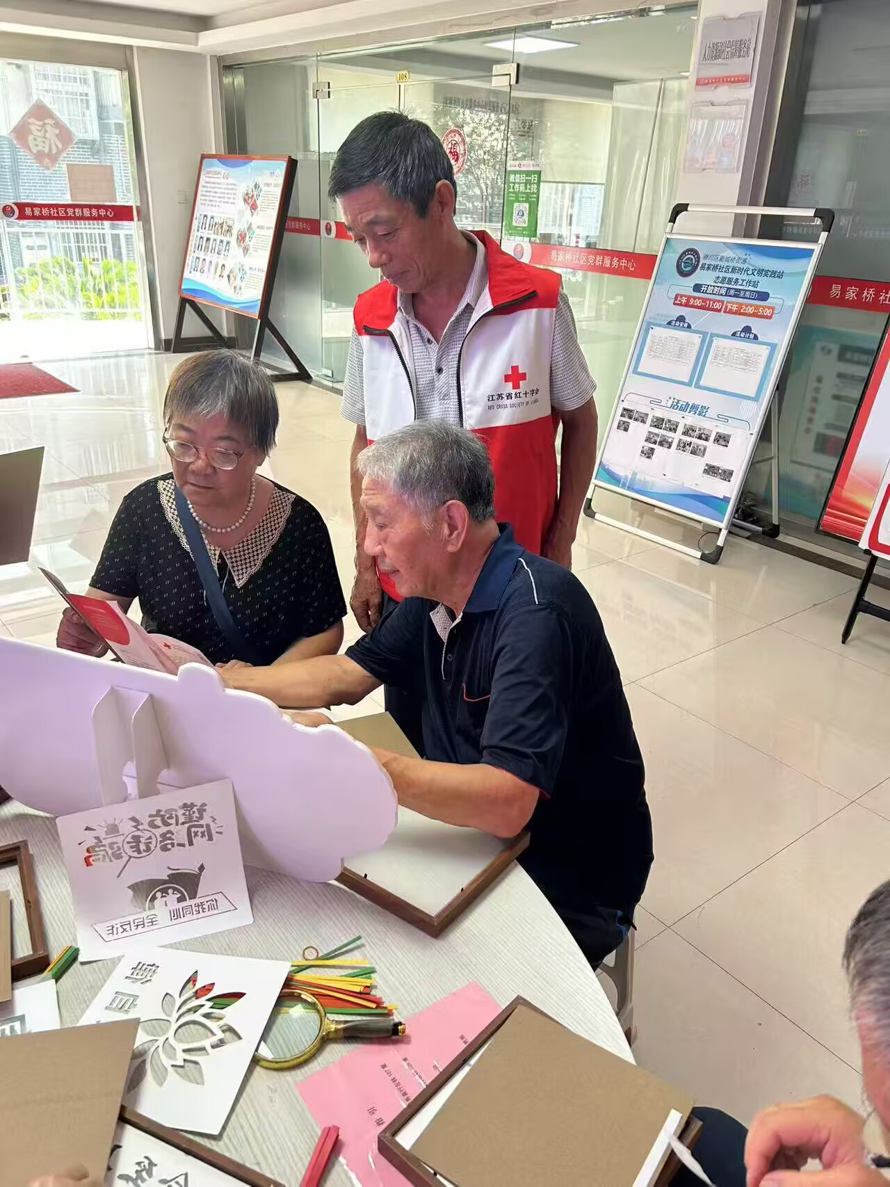 活动伊始,红十字志愿者蔡师傅为大家生动讲解了红十字运动的发展史与“人道、博爱、奉献”的精神内涵。居民们还现场学习了《红十字会法》和急救知识,进一步增强了健康防护意识。在随后的创作环节,大家围坐在一起,用彩绳、竹条等材料,将“清廉”、“孝道”等美好寓意编织进一幅幅精美的竹编画中。现场气氛热烈,欢声笑语不断,既锻炼了动手能力,也增进了邻里情谊。